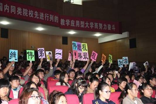 2011年10月31日,在全院师生的热切期盼中,由院团委举办的“金苑之秋 新声夺人”2011级校园十佳歌手总决赛在新图书馆剧场拉开了冠军争夺赛的帷幕。副院长徐春香、各系党总支书记、院团委书记、副书记出席了本场比赛并担任颁奖嘉宾,学报编辑部主任冯晶珩、法律系教师梁龙、各系团总支书记担任评委。