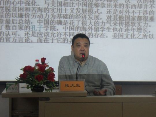为深入学习和贯彻中共中央十七届六中全会精神,构建先进校园文化,提升当代大学生的文化素质,促进学生全面发展,12月1日,应我院科研处、学工部、投资保险系邀请,黑龙江大学国际礼仪与跨文化沟通研究所所长张大生博士(教授)在实验中心206室以“如何打造中国文化软实力”为主题,围绕学习贯彻十七届六中全会决定的体会,进行了一次生动的专题讲座。学生工作部部长(团委书记)吴治成、投资保险系全体学生工作者参加讲座。