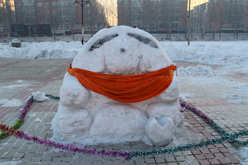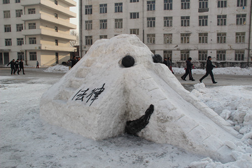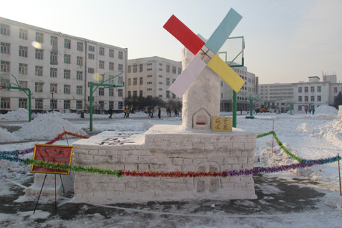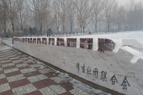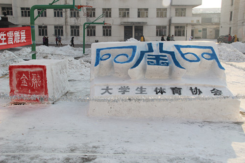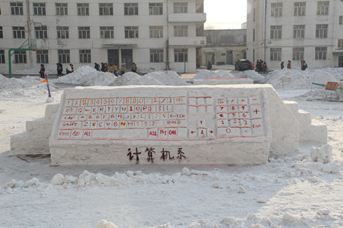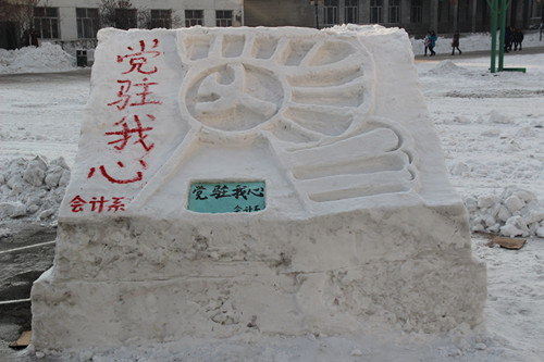 在院团委的号召下和各系团总支的大力配合下,同学们热情高涨,积极设计作品方案,经过3天的精心创作,为本次展出献上了17件雪雕作品。同学们在美丽的校园切磋技艺,在冰天雪地中挥舞雪铲,用自己的聪明才智创作出一件件美丽的作品。本次雪雕展共有四类主题作品,即视觉冲击力强的红色文化作品,包括中国地图、党徽、伟人毛泽东同志头像等;空间效果强烈的建筑类作品,包括长城、象牙塔、荷兰风车等;雕刻技巧成熟的动漫类作品;其他类作品,包括校徽、计算机键盘、棋盘等。学生们用独特的艺术情趣为我院增添一道靓丽的风景,吸引了广大师生们的驻足观赏。