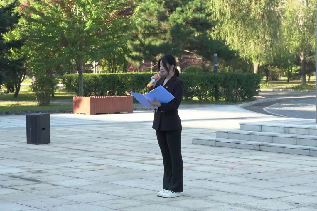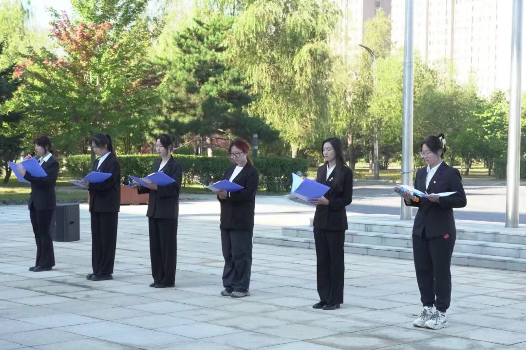 青年学生代表于子祺等6人朗诵诗歌《勿忘九一八,共筑中国梦》,回顾了九一八事变历史背景与深远影响,颂扬了革命先烈们的英勇事迹与崇高精神,并号召新时代青年自觉担当尽责,在实现中华民族伟大复兴中国梦的新征程上奋勇前进。随后,校学生组织代表庄沐雪领誓,全体学生面向国旗,高举右拳,郑重宣誓,铿锵有力的誓言不仅是对历史的回应与传承,更是对未来的期许与承诺。仪式最后,全体师生同唱团歌《光荣啊,中国共青团》,激励在场每一位青年学子铭记历史、挺膺担当、砥砺前行。