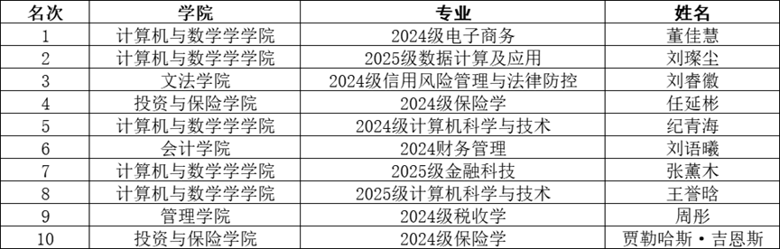 赛场上,来自各七个学院代表队的选手沉着应对、各展所长,协同作战、合力攻坚,呈现了一场精彩的“团体智慧角逐”。经过激烈比拼,计算机与数学学院获得团体总分第一名、投资与保险学院第二名、文法学院第三名。其中,十名选手以扎实的基本功和敏锐的临场应变能力在激烈的比赛中脱颖而出,获得个人比赛成绩前十名的好成绩。